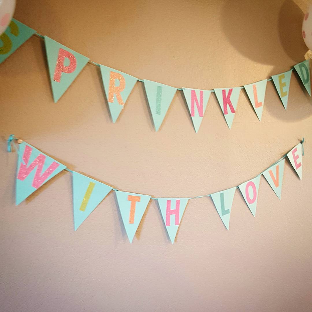 1. Decorations: I really didn’t decorate too much as all of the pretty desserts acted as decorations. I did find some polka dot balloons from Target that went with their “Hello Baby” polka dot plates, cups, and napkins. They were close enough to sprinkles and looked adorable! We inflated a few of the balloons at our local dollar store and that added a lot to the sprinkle vibe. I also went to work on making a “SPRINKLED WITH LOVE” This was the more time-consuming item out of everything. I thought it really pulled everything together and was fairly cheap to make. I found the glitter sticker letters at Michael’s for under $6 with a coupon (I am totally a coupon queen) and teal scrapbook paper that I cut the triangles out of. I stuck the letters on and taped them to some ribbon I had and ta-da! Very easy and it really turned out cute!