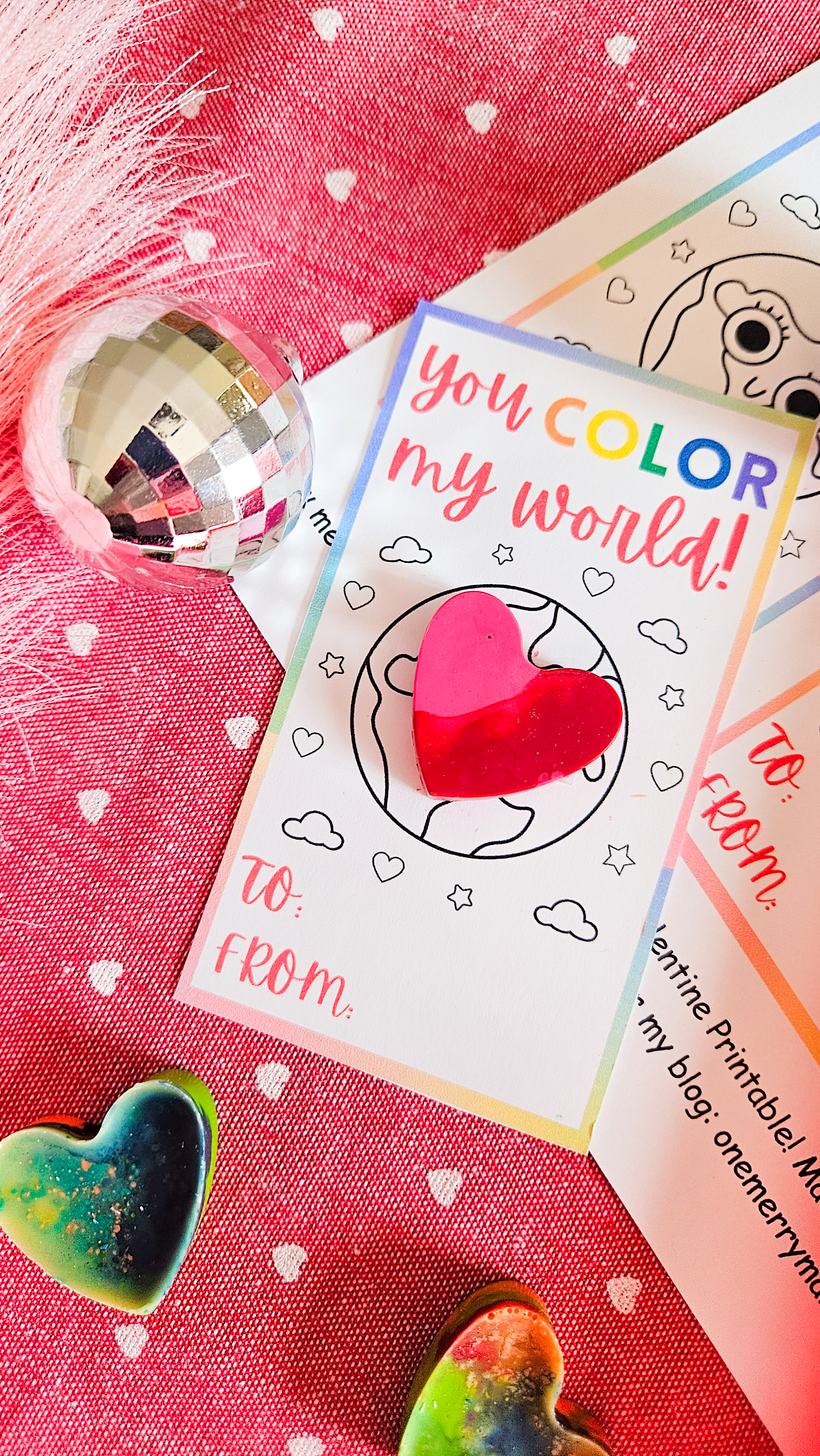 Find your mold, put crayons (I used already broken ones to recycle!) In warm water for 10 minutes. The wrappers peel off so much easier!! Break and fill in mold. Bake at 275Β° for 20 minutes, let cool, and attach to my cute free printable!