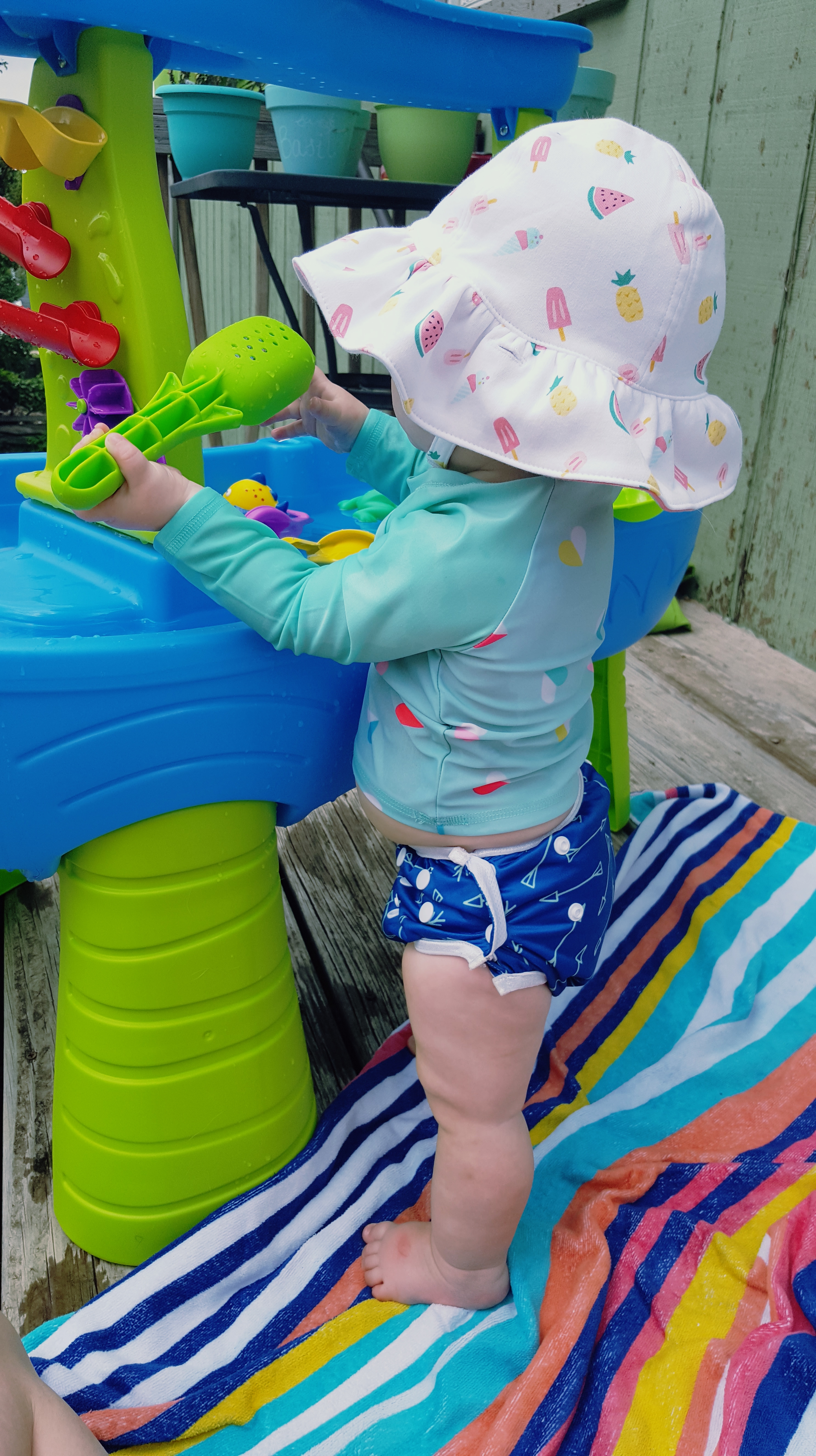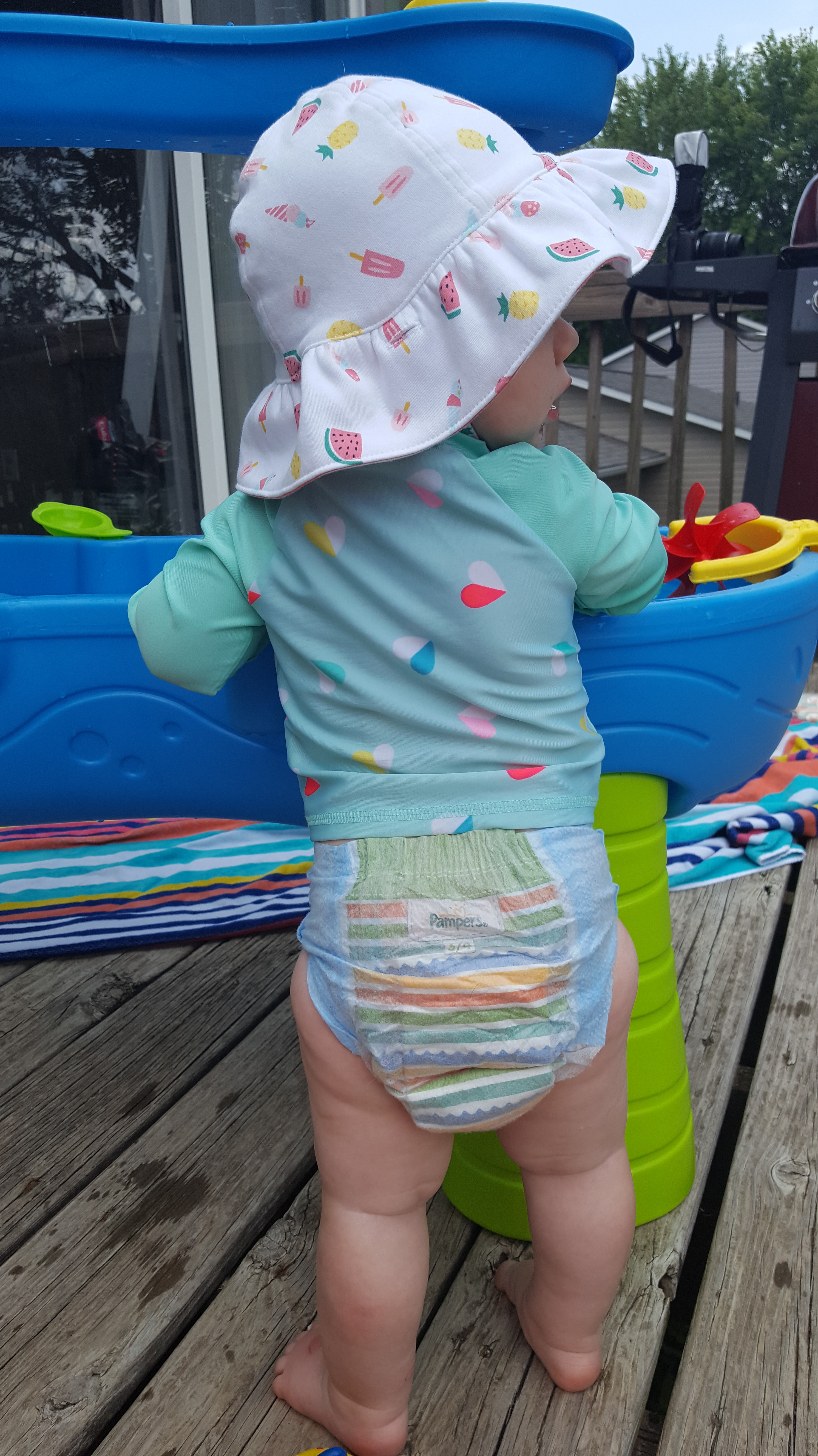 AMOUNT OF CHANGES: I found that even just from playing at our splash table, after 1 hour, her disposable diaper was starting to sag and we needed a new one! She wasn’t even submerged! That would be fine if that was all we were doing for the day, but next week we plan on going on vacation and will be hitting the pool/beach pretty much all day for 9 days. That will definitely add up with the amount of changes we would need!