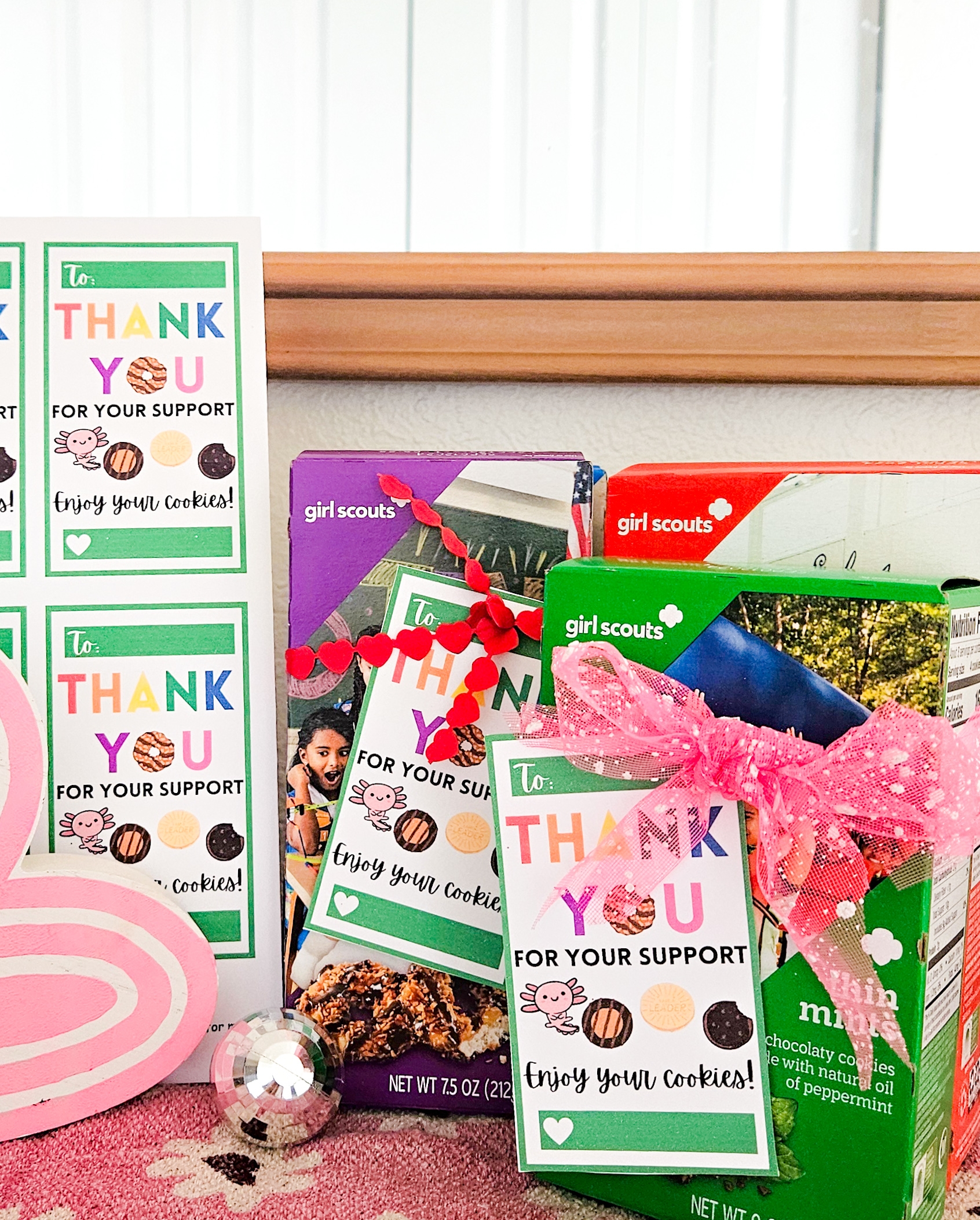 I attached mine with tape for some or added ribbon for some flair! I love it because it allows my daughter to say “thank you” and helps me keep track of cookie orders!