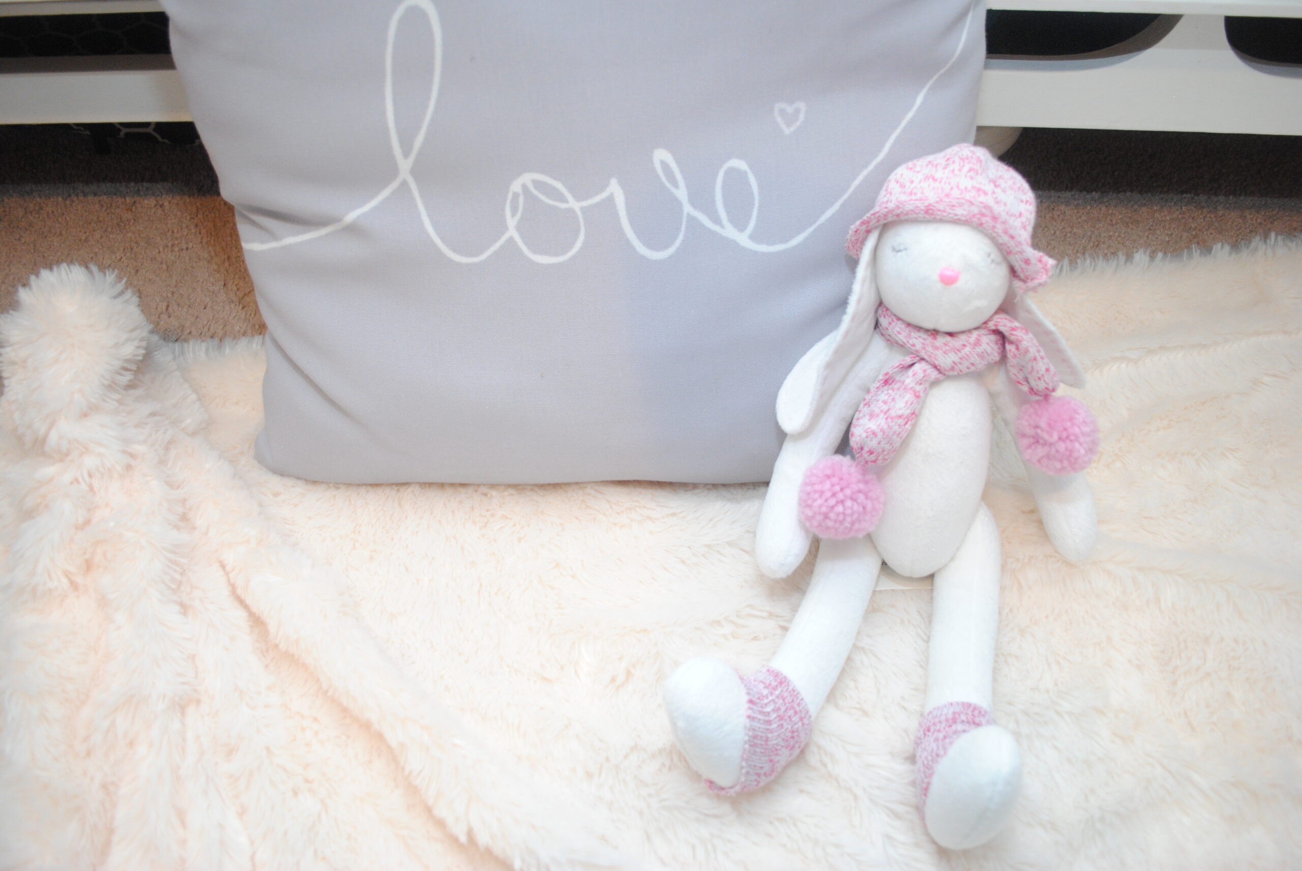 It is so cute! It comes with little accessories that can come off/on so your little one can dress it up. It comes with a hat, scarf, and leg warmers. It is the perfect little cuddle toy for the winter months! I love the light pink that comes with it. It looks so elegant and vintage with the soft ivory and light pink. The ears are made to be big enough to also include personalization!