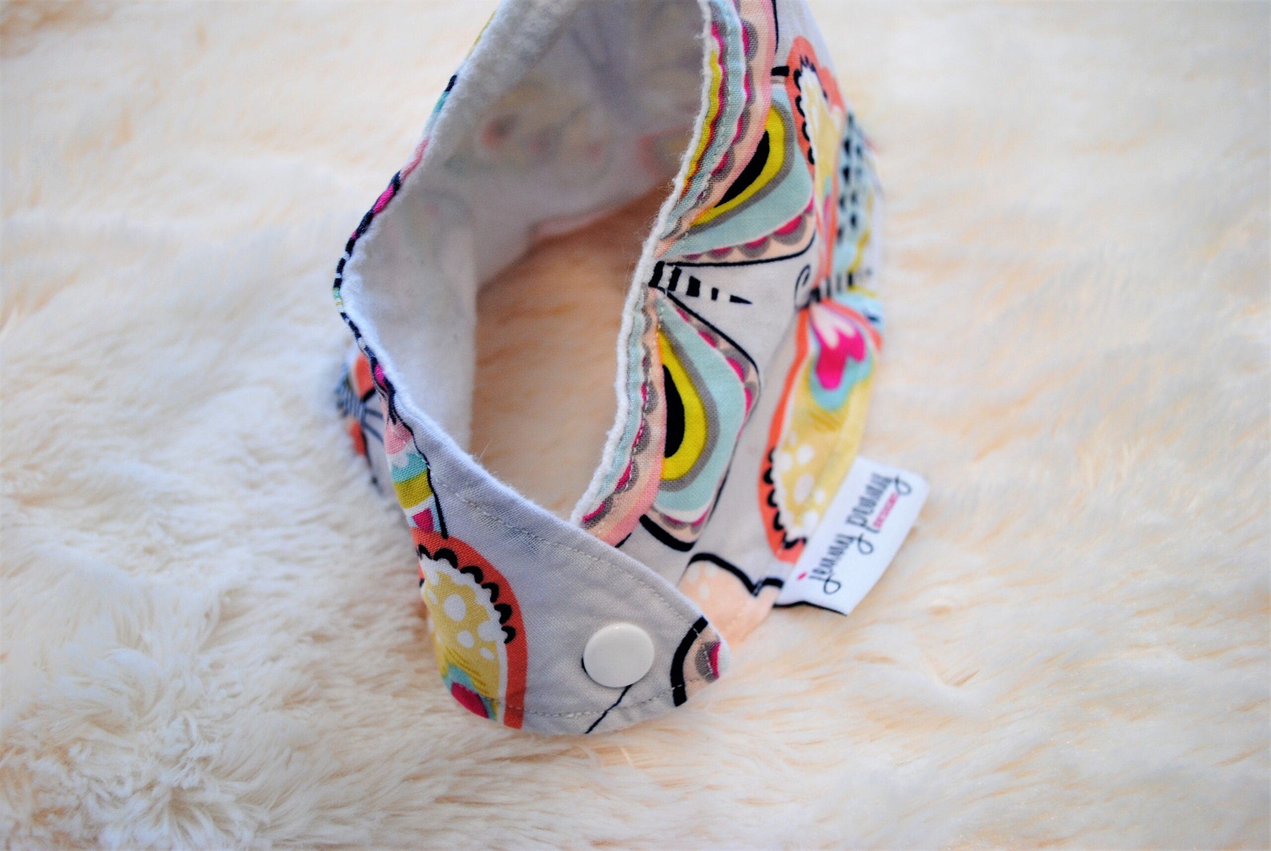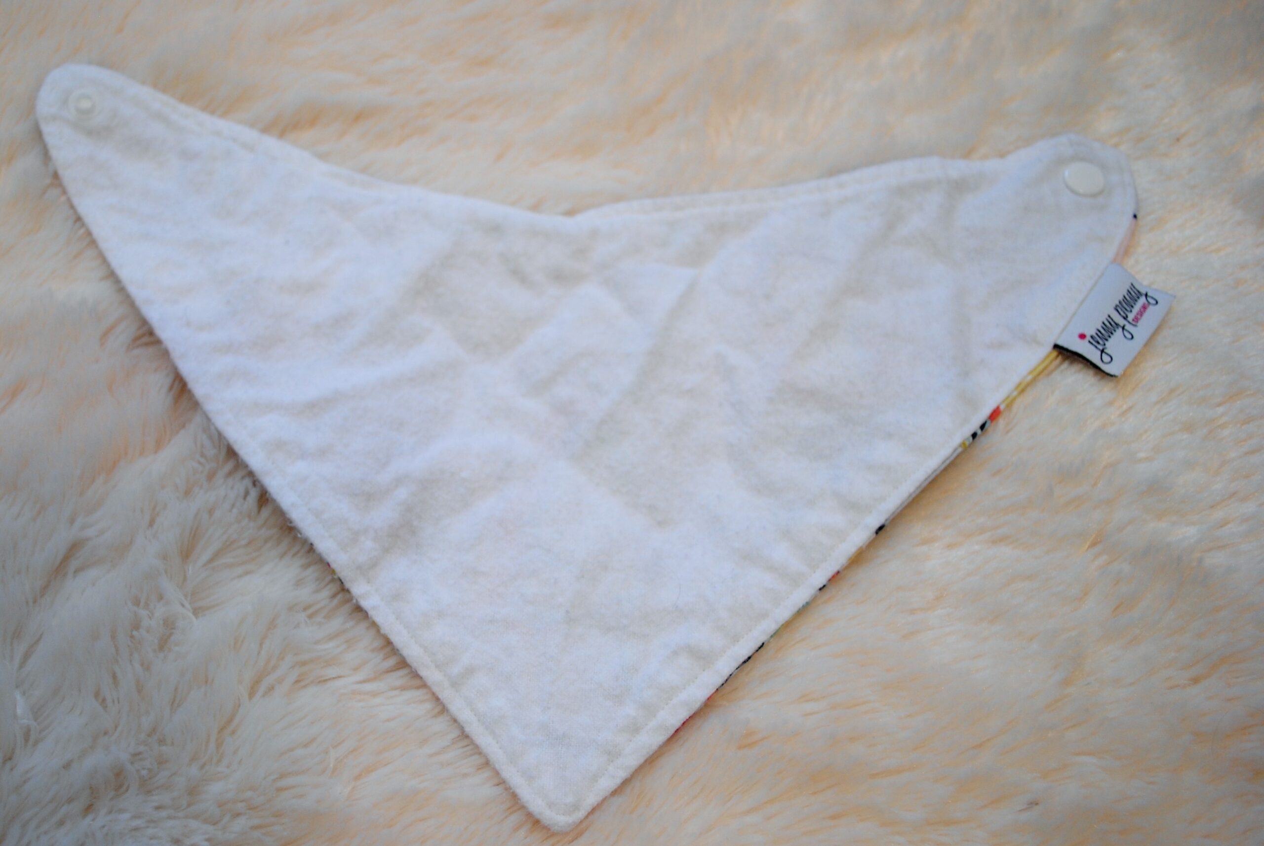 The bibs are made with 100 % cotton fabric and flannel fabric on the back. It’s super soft and very absorbent. The buttons are great- strong and durable- as opposed to velcro that can irritate your little one’s neck.