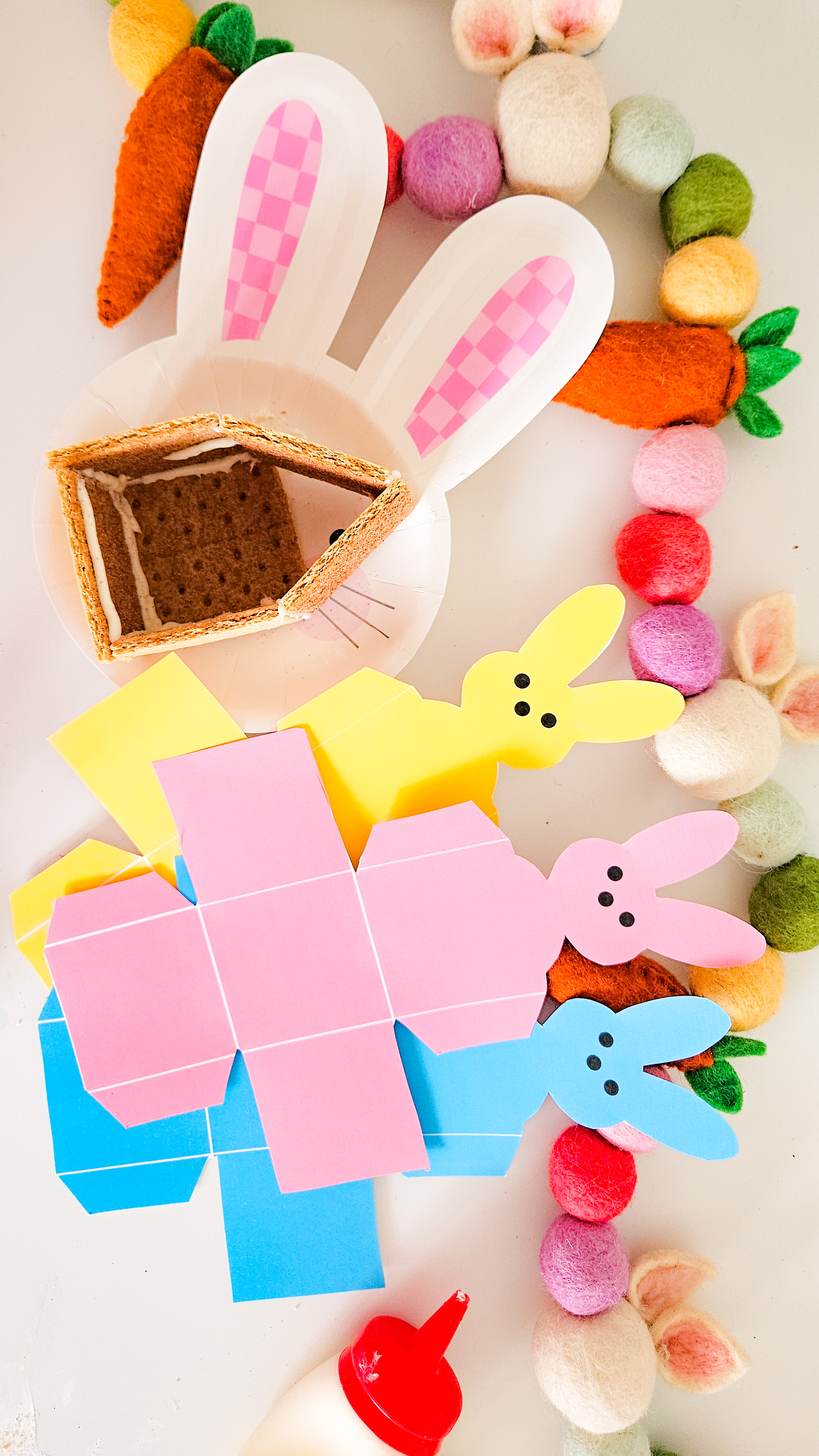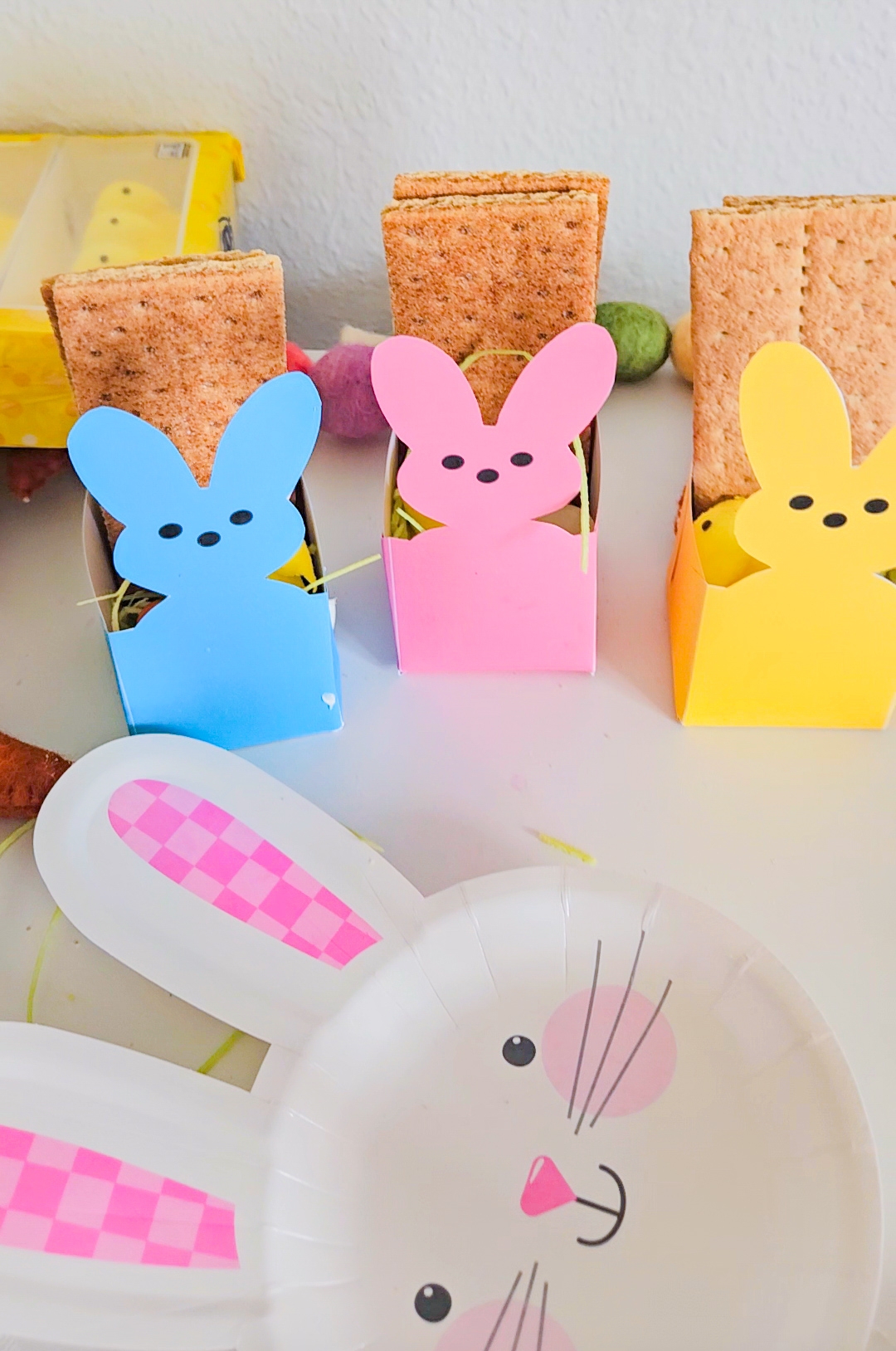 I also made a peep version printable bunny basket to fill with the ingredients for their snack! This would make a great party favor holder also!!