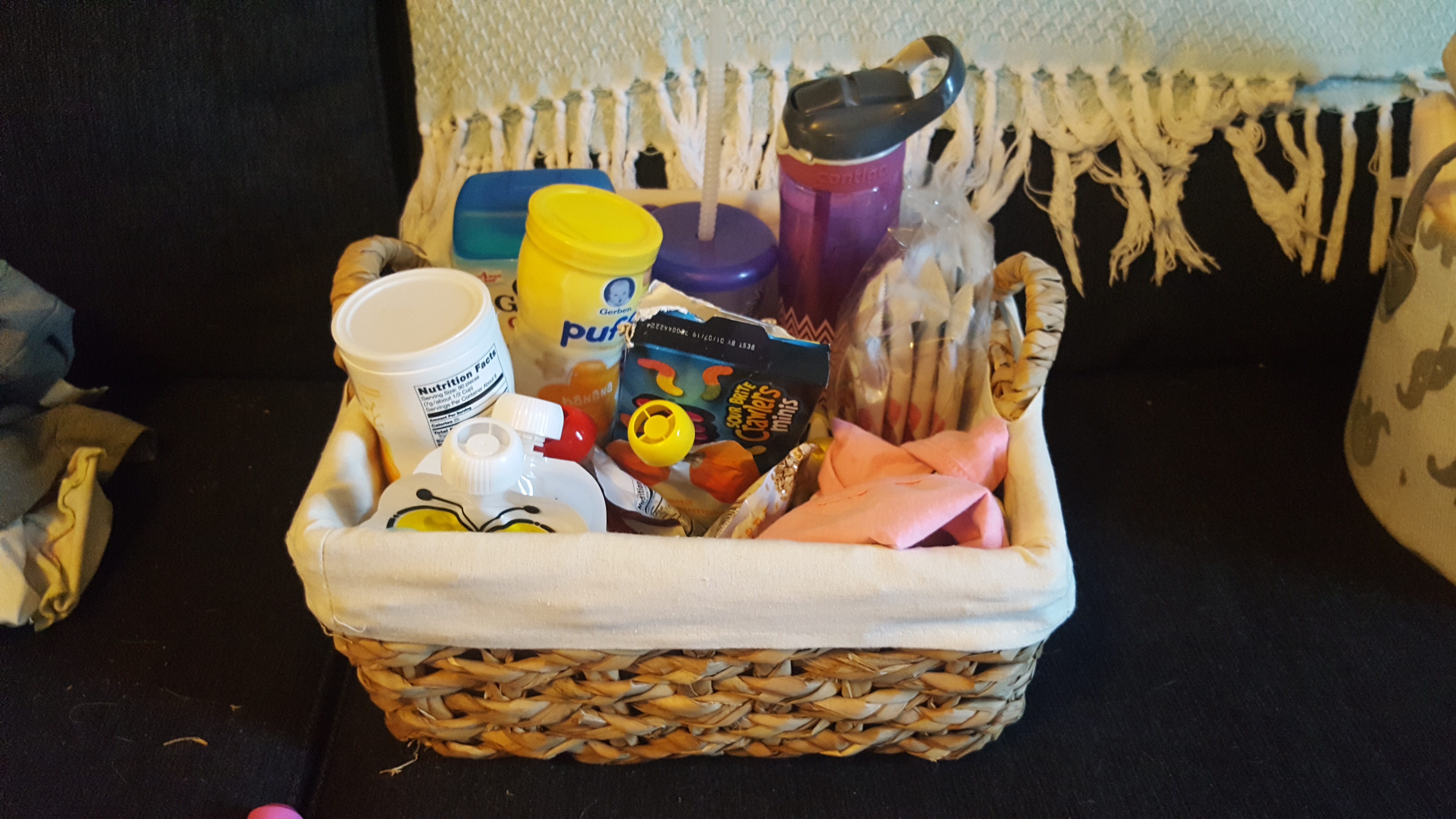 This was super handy as well!!! We put sippy cups, bottles, puffs, cheerios, rice rusks and baby food in a basket. It was easy to access for our pit stops. I loved how organized it was. It made it a lot easier to grab a quick bite for her when she was fussy.