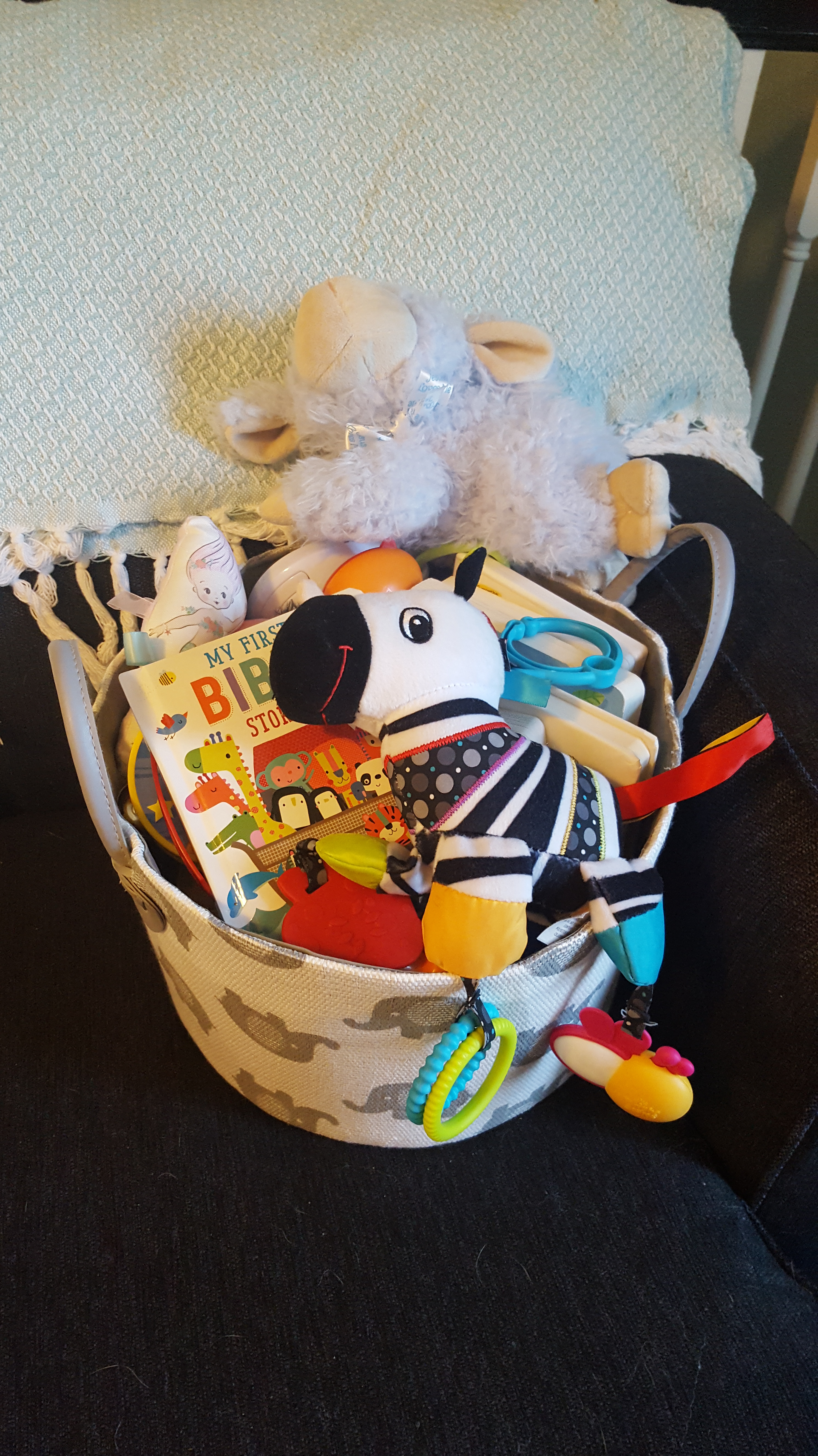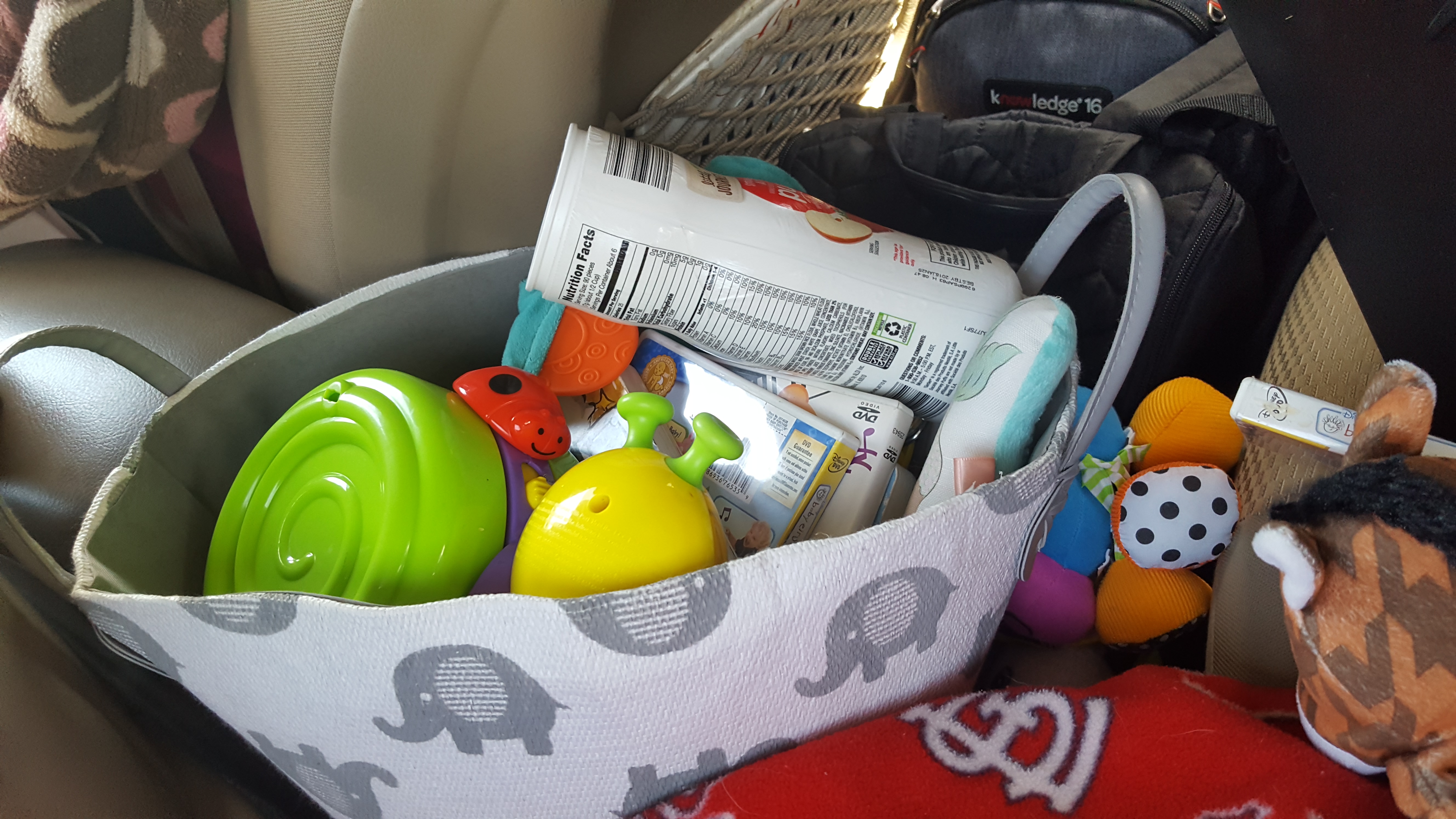 4. Have a bin of toys within reach We came prepared with a basket full of toys. It was so handy for when she would start fussing. I didn’t have to search all over for toys or dig into her diaper bag. When she got sick of a toy, I just reached in and grabbe another. It was something so easy to do and really helped us keep her happy for longer in her carseat!
