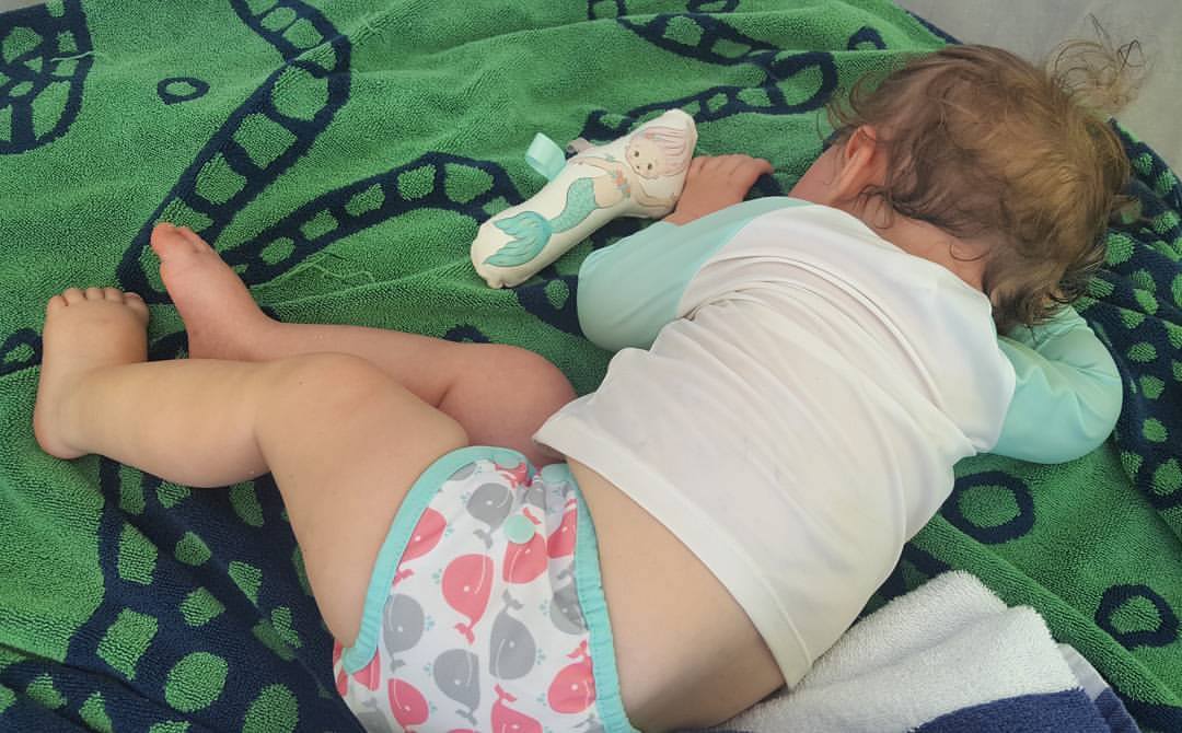 Unlike disposables that pull on or reusables that only have one side snap, Thirsties swim diapers snap on super easy on BOTH sides. I love this because when there is a code brown, I don’t have to deal with the poo touching her leg as I pull off the disposable diaper. Same with reusable diapers that only have one side snap, it makes it just a little bit easier but you still have to pull it down around their other leg. It’s not easy.
