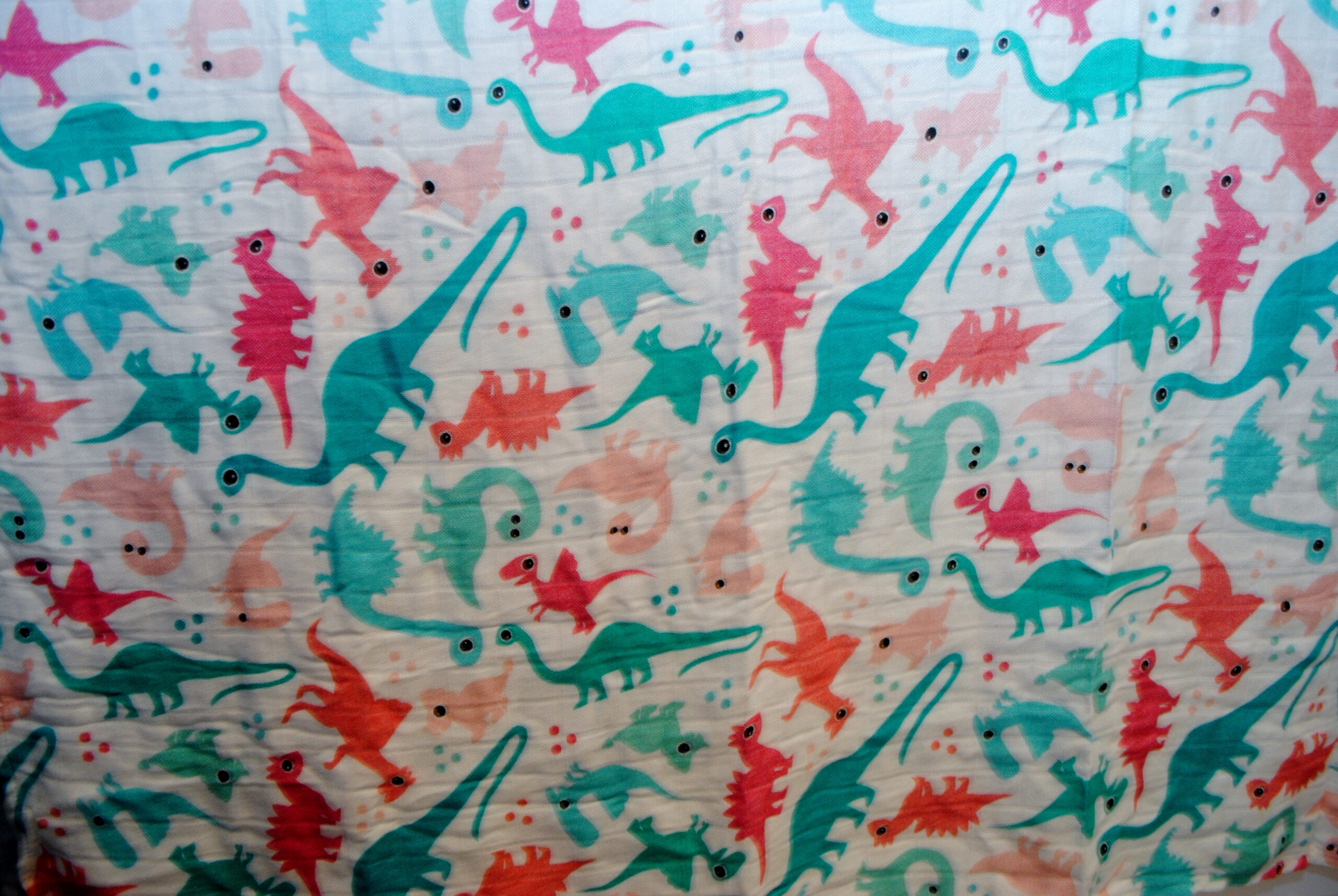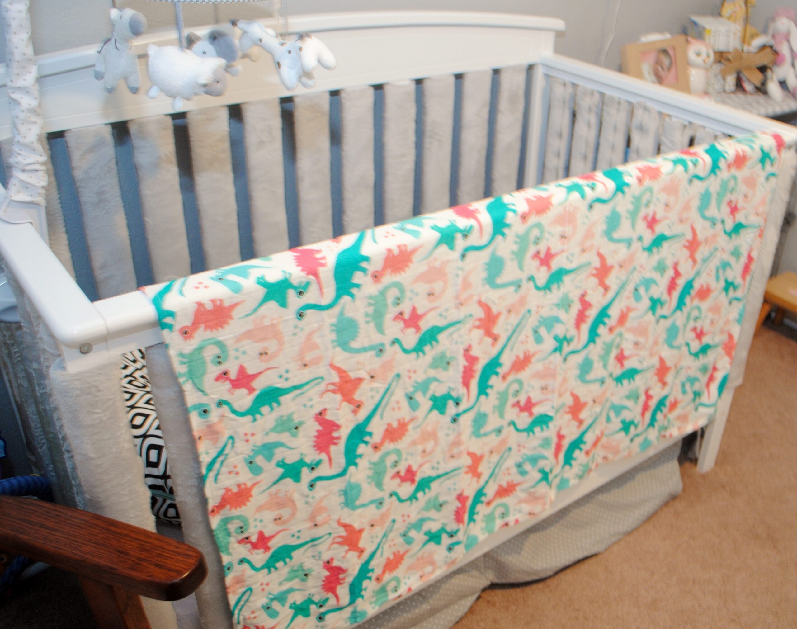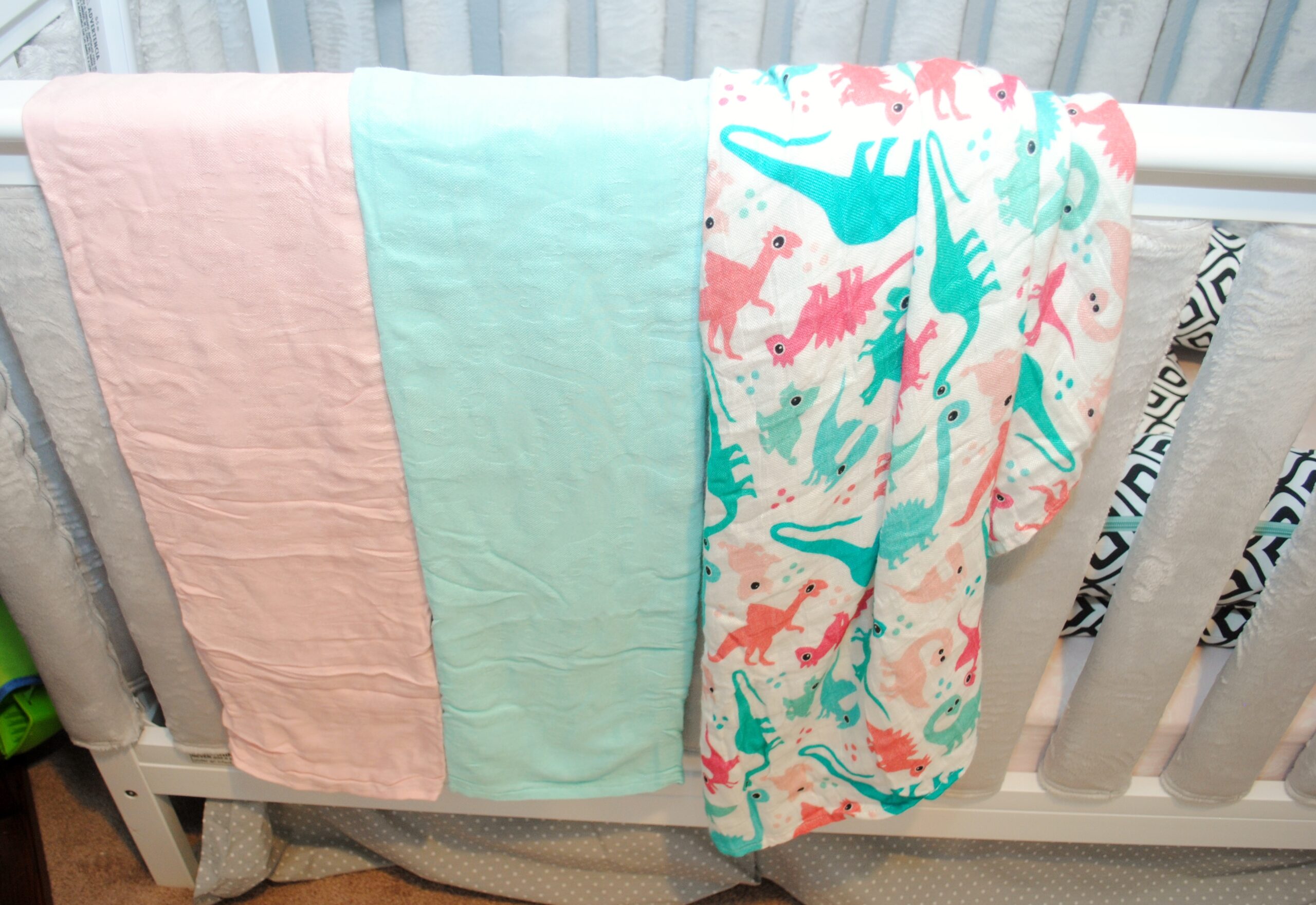 The set comes with one “printed” blanket and two other “solid” blankets. I say this because even though they are techincally “Solid” they are anything but plain. The details on each blanket are incredible. On the solid blankets, you can see the dinosaur print woven into the design. How cool!?
