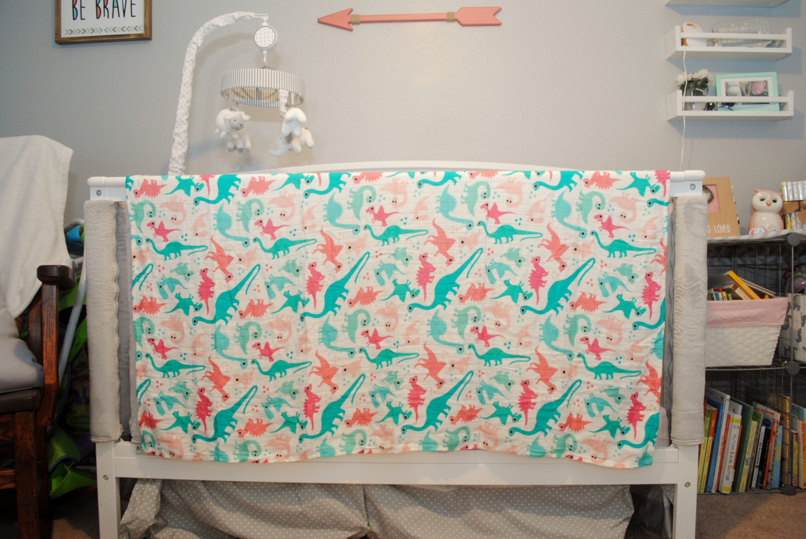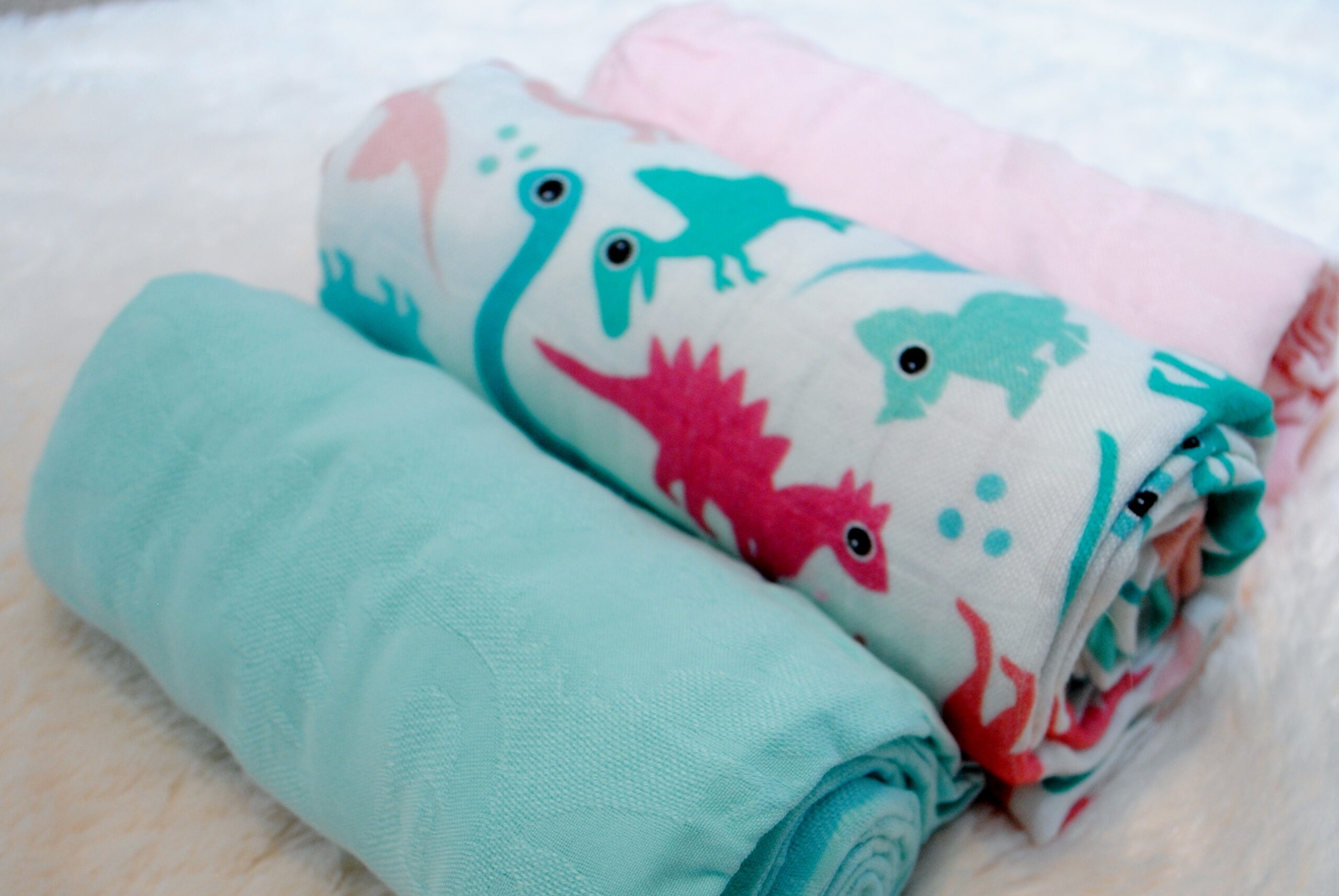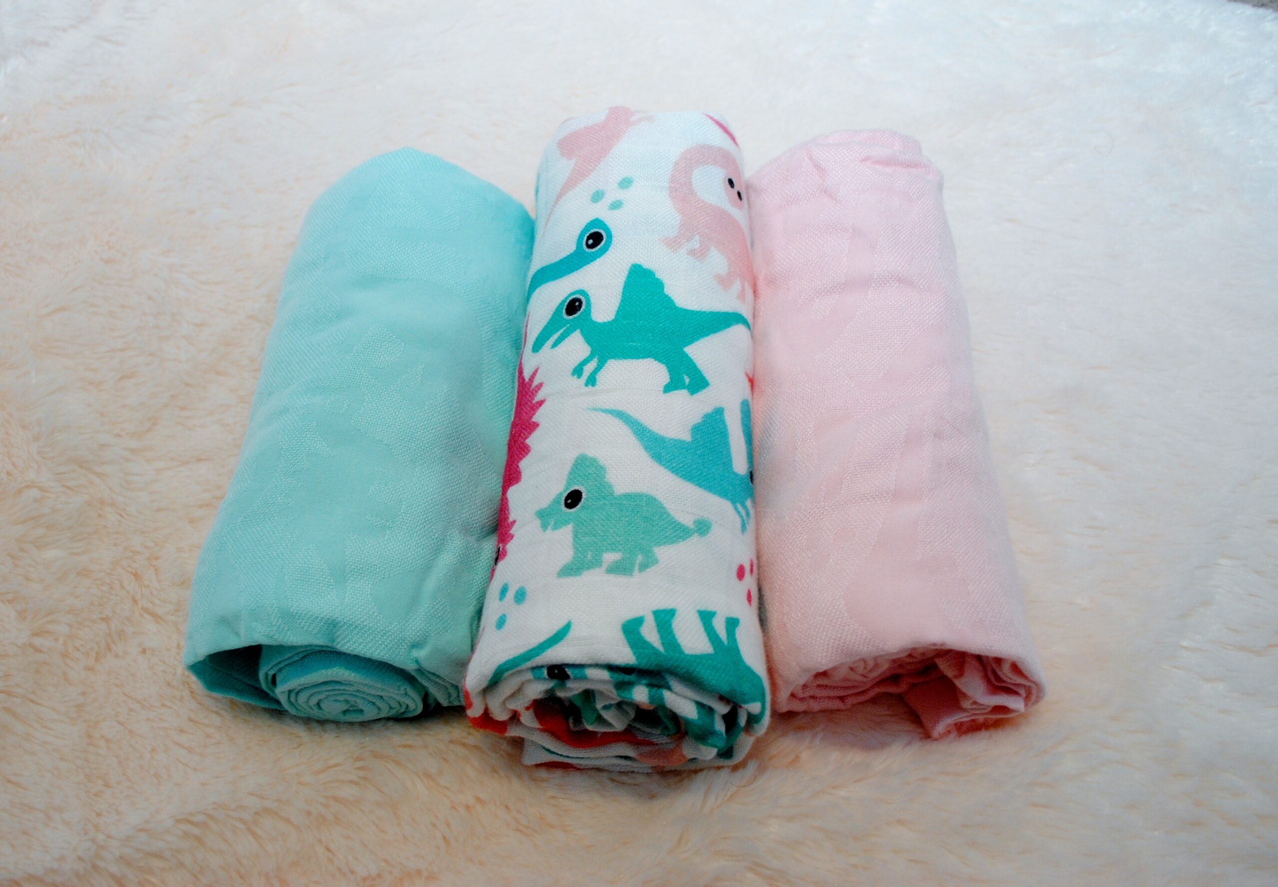 The set comes with one “printed” blanket and two other “solid” blankets. I say this because even though they are techincally “Solid” they are anything but plain. The details on each blanket are incredible. On the solid blankets, you can see the dinosaur print woven into the design. How cool!?